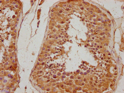 IHC image of CSB-PA011871NA01HU diluted at 1:500 and staining in paraffin-embedded human testis tissue performed on a Leica BondTM system. After dewaxing and hydration, antigen retrieval was mediated by high pressure in a citrate buffer (pH 6.0). Section was blocked with 10% normal goat serum 30min at RT. Then primary antibody (1% BSA) was incubated at 4°C overnight. The primary is detected by a biotinylated secondary antibody and visualized using an HRP conjugated SP system.