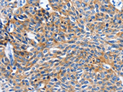 The image on the left is immunohistochemistry of paraffin-embedded Human esophagus cancer tissue using CSB-PA932598(ITGAL Antibody) at dilution 1/20, on the right is treated with synthetic peptide. (Original magnification: ×200)