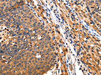 The image on the left is immunohistochemistry of paraffin-embedded Human gastic cancer tissue using CSB-PA073350(ITGAM Antibody) at dilution 1/10, on the right is treated with synthetic peptide. (Original magnification: ×200)