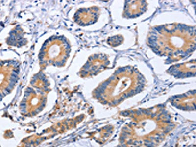 The image on the left is immunohistochemistry of paraffin-embedded Human colon cancer tissue using CSB-PA546880(ITGB5 Antibody) at dilution 1/40, on the right is treated with fusion protein. (Original magnification: ×200)