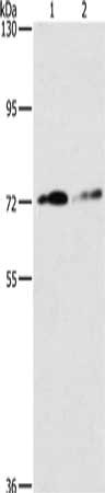 Gel: 6%SDS-PAGE, Lysate: 40 μg, Lane 1-2: PC3 cells, K562 cells, Primary antibody: CSB-PA939542(ITGB7 Antibody) at dilution 1/200, Secondary antibody: Goat anti rabbit IgG at 1/8000 dilution, Exposure time: 10 minutes
