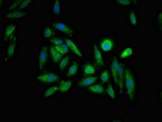 Immunofluorescent analysis of Hela cells using CSB-PA614538LA01HU at dilution of 1:100 and Alexa Fluor 488-congugated AffiniPure Goat Anti-Rabbit IgG(H+L)
