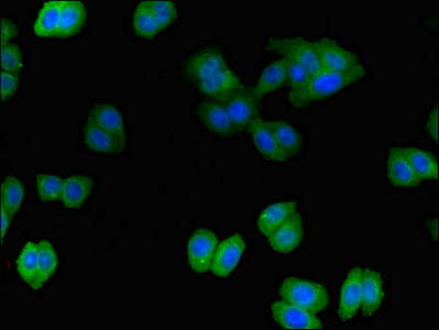 Immunofluorescent analysis of HepG2 cells using CSB-PA873709LA01HU at dilution of 1:100 and Alexa Fluor 488-congugated AffiniPure Goat Anti-Rabbit IgG(H+L)
