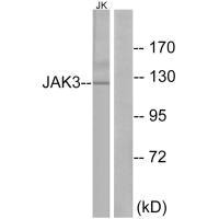 免疫原:Synthesized non-phosphopeptide derived from Human JAK3 around the phosphorylation site of tyrosine 785 (S-D-Y(p)-E-L).