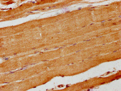 IHC image of CSB-PA614803LA01HU diluted at 1:200 and staining in paraffin-embedded human skeletal muscle tissue performed on a Leica BondTM system. After dewaxing and hydration, antigen retrieval was mediated by high pressure in a citrate buffer (pH 6.0). Section was blocked with 10% normal goat serum 30min at RT. Then primary antibody (1% BSA) was incubated at 4°C overnight. The primary is detected by a biotinylated secondary antibody and visualized using an HRP conjugated SP system.