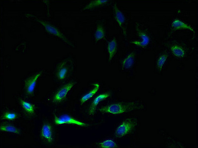 Immunofluorescent analysis of Hela cells using CSB-PA012047LA01HU at dilution of 1:100 and Alexa Fluor 488-congugated AffiniPure Goat Anti-Rabbit IgG(H+L)