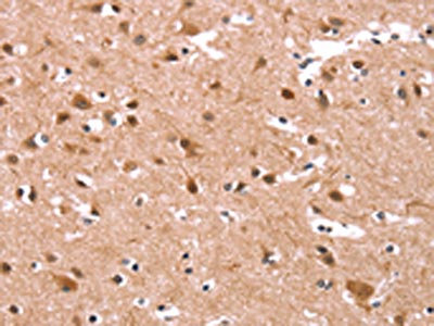 The image on the left is immunohistochemistry of paraffin-embedded Human brain tissue using CSB-PA564451(KCNJ6 Antibody) at dilution 1/40, on the right is treated with synthetic peptide. (Original magnification: ×200)