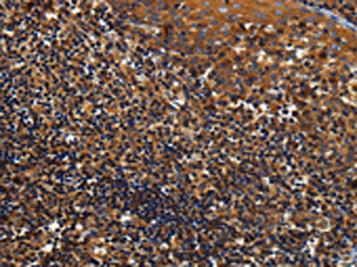 The image on the left is immunohistochemistry of paraffin-embedded Human tonsil tissue using CSB-PA972784(KCNK17 Antibody) at dilution 1/60, on the right is treated with fusion protein. (Original magnification: ×200)