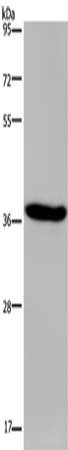 Gel: 8%SDS-PAGE, Lysate: 40 μg, Lane: LO2 cells, Primary antibody: CSB-PA972784(KCNK17 Antibody) at dilution 1/300, Secondary antibody: Goat anti rabbit IgG at 1/8000 dilution, Exposure time: 10 seconds
