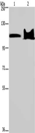 • Gel: 6%SDS-PAGE, Lysate: 40 μg, Lane 1-2: Mouse heart tissue, Mouse brain tissue, Primary antibody: CSB-PA858652(KDM4C Antibody) at dilution 1/800, Secondary antibody: Goat anti rabbit IgG at 1/8000 dilution, Exposure time: 1 minute