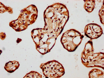 IHC image of CSB-PA880944LA01HU diluted at 1:400 and staining in paraffin-embedded human placenta tissue performed on a Leica BondTM system. After dewaxing and hydration, antigen retrieval was mediated by high pressure in a citrate buffer (pH 6.0). Section was blocked with 10% normal goat serum 30min at RT. Then primary antibody (1% BSA) was incubated at 4°C overnight. The primary is detected by a biotinylated secondary antibody and visualized using an HRP conjugated SP system.