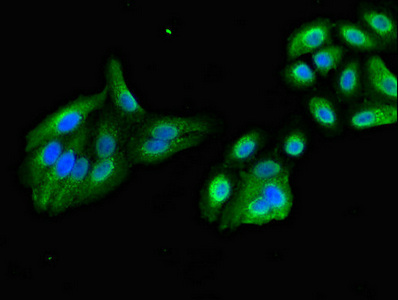 Immunofluorescent analysis of HepG2 cells using CSB-PA865208LA01HU at dilution of 1:100 and Alexa Fluor 488-congugated AffiniPure Goat Anti-Rabbit IgG(H+L)