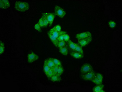 Immunofluorescence staining of HepG2 cells with CSB-PA012347LA01HU at 1:133, counter-stained with DAPI. The cells were fixed in 4% formaldehyde, permeabilized using 0.2% Triton X-100 and blocked in 10% normal Goat Serum. The cells were then incubated with the antibody overnight at 4°C. The secondary antibody was Alexa Fluor 488-congugated AffiniPure Goat Anti-Rabbit IgG(H+L).