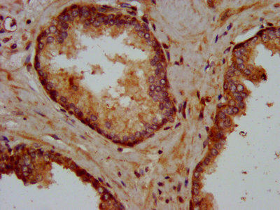 IHC image of CSB-PA012347LA01HU diluted at 1:400 and staining in paraffin-embedded human prostate cancer performed on a Leica BondTM system. After dewaxing and hydration, antigen retrieval was mediated by high pressure in a citrate buffer (pH 6.0). Section was blocked with 10% normal goat serum 30min at RT. Then primary antibody (1% BSA) was incubated at 4°C overnight. The primary is detected by a biotinylated secondary antibody and visualized using an HRP conjugated SP system.