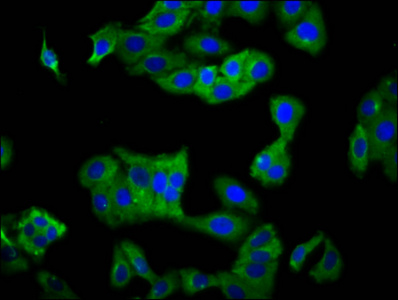 Immunofluorescence staining of HepG2 cells with CSB-PA619902LA01HU at 1:100, counter-stained with DAPI. The cells were fixed in 4% formaldehyde, permeabilized using 0.2% Triton X-100 and blocked in 10% normal Goat Serum. The cells were then incubated with the antibody overnight at 4°C. The secondary antibody was Alexa Fluor 488-congugated AffiniPure Goat Anti-Rabbit IgG(H+L).