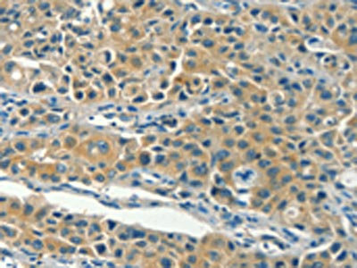 The image on the left is immunohistochemistry of paraffin-embedded Human colon cancer tissue using CSB-PA034861(KLC1 Antibody) at dilution 1/40, on the right is treated with fusion protein. (Original magnification: ×200)