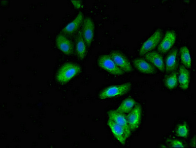Immunofluorescent analysis of HepG2 cells using CSB-PA012564LA01HU at dilution of 1:100 and Alexa Fluor 488-congugated AffiniPure Goat Anti-Rabbit IgG(H+L)