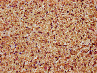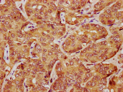 IHC image of CSB-PA012769LA01HU diluted at 1:1200 and staining in paraffin-embedded human liver cancer performed on a Leica BondTM system. After dewaxing and hydration, antigen retrieval was mediated by high pressure in a citrate buffer (pH 6.0). Section was blocked with 10% normal goat serum 30min at RT. Then primary antibody (1% BSA) was incubated at 4°C overnight. The primary is detected by a biotinylated secondary antibody and visualized using an HRP conjugated SP system.
