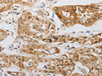 The image on the left is immunohistochemistry of paraffin-embedded Human lung cancer tissue using CSB-PA914116(LEPR Antibody) at dilution 1/20, on the right is treated with synthetic peptide. (Original magnification: ×200)