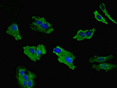 Immunofluorescent analysis of Hela cells using CSB-PA012955ESR1HU at dilution of 1:100 and Alexa Fluor 488-congugated AffiniPure Goat Anti-Rabbit IgG(H+L)