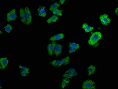 Immunofluorescence staining of HepG2 cells with CSB-PA017336OA01HU at 1:100, counter-stained with DAPI. The cells were fixed in 4% formaldehyde, permeabilized using 0.2% Triton X-100 and blocked in 10% normal Goat Serum. The cells were then incubated with the antibody overnight at 4°C. The secondary antibody was Alexa Fluor 488-congugated AffiniPure Goat Anti-Rabbit IgG(H+L).