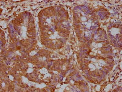 IHC image of CSB-PA017336OA01HU diluted at 1:200 and staining in paraffin-embedded human colon cancer performed on a Leica BondTM system. After dewaxing and hydration, antigen retrieval was mediated by high pressure in a citrate buffer (pH 6.0). Section was blocked with 10% normal goat serum 30min at RT. Then primary antibody (1% BSA) was incubated at 4°C overnight. The primary is detected by a biotinylated secondary antibody and visualized using an HRP conjugated SP system.