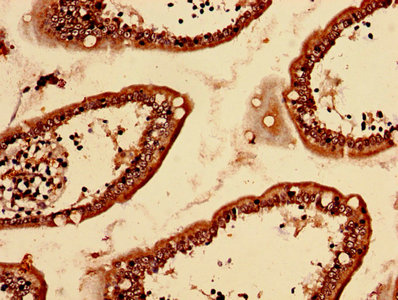 Immunohistochemistry analysis of human small intestine tissue using CSB-PA013070LA01HU at dilution of 1:100