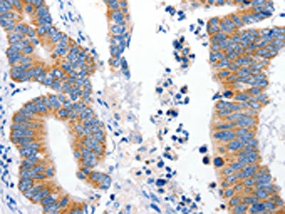 The image on the left is immunohistochemistry of paraffin-embedded Human colon cancer tissue using CSB-PA087523(LRP2 Antibody) at dilution 1/16, on the right is treated with synthetic peptide. (Original magnification: ×200)