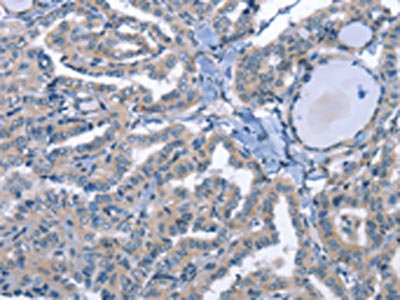 The image on the left is immunohistochemistry of paraffin-embedded Human thyroid cancer tissue using CSB-PA902150(LRRK2 Antibody) at dilution 1/30, on the right is treated with fusion protein. (Original magnification: ×200)