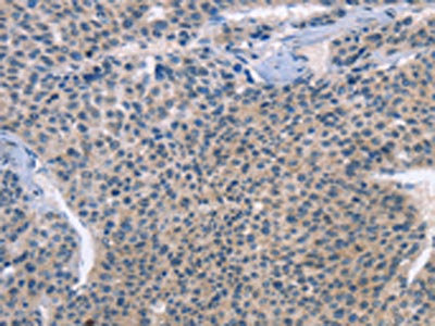 The image on the left is immunohistochemistry of paraffin-embedded Human liver cancer tissue using CSB-PA902150(LRRK2 Antibody) at dilution 1/30, on the right is treated with fusion protein. (Original magnification: ×200)
