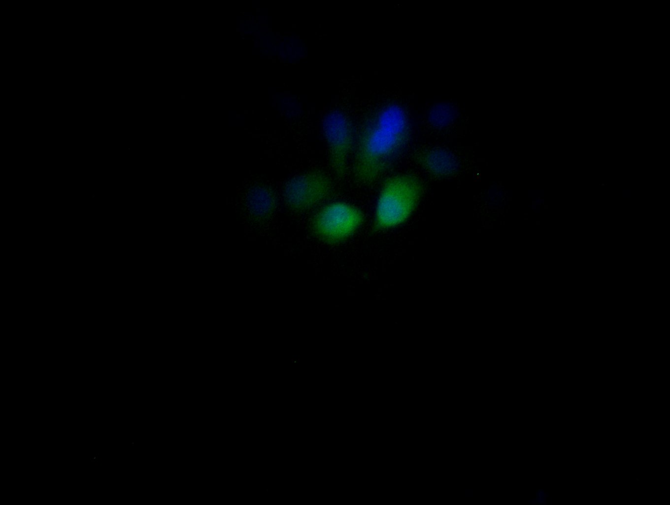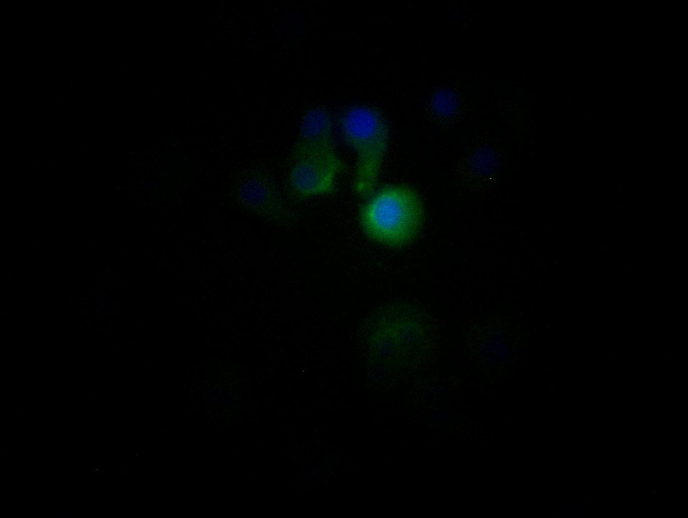 Immunofluorescent analysis of HepG2 cells using CSB-PA013207HA01HU at dilution of 1:100 and Alexa Fluor 488-congugated AffiniPure Goat Anti-Rabbit IgG(H+L)