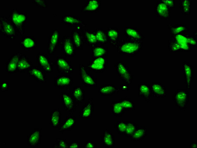 Immunofluorescence staining of Hela cells with CSB-PA882130LA01HU at 1:166, counter-stained with DAPI. The cells were fixed in 4% formaldehyde, permeabilized using 0.2% Triton X-100 and blocked in 10% normal Goat Serum. The cells were then incubated with the antibody overnight at 4°C. The secondary antibody was Alexa Fluor 488-congugated AffiniPure Goat Anti-Rabbit IgG(H+L).