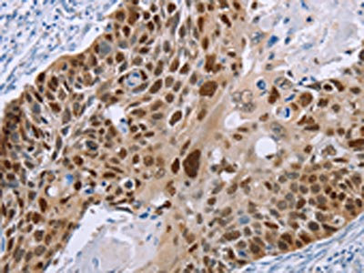 The image on the left is immunohistochemistry of paraffin-embedded Human esophagus cancer tissue using CSB-PA216191(MAGEA10 Antibody) at dilution 1/50, on the right is treated with fusion protein. (Original magnification: ×200)