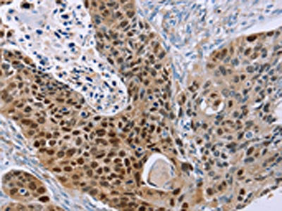 The image on the left is immunohistochemistry of paraffin-embedded Human esophagus cancer tissue using CSB-PA956333(MAGEA10 Antibody) at dilution 1/30, on the right is treated with fusion protein. (Original magnification: ×200)