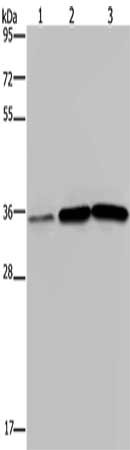 Gel: 10%SDS-PAGE, Lysate: 40 μg, Lane 1-3: Human testis tissue, A549 cells, PC3 cells, Primary antibody: CSB-PA146268(MAGEA3 Antibody) at dilution 1/400, Secondary antibody: Goat anti rabbit IgG at 1/8000 dilution, Exposure time: 2 minutes