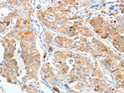 The image on the left is immunohistochemistry of paraffin-embedded Human lung cancer tissue using CSB-PA587080(MANF Antibody) at dilution 1/50, on the right is treated with synthetic peptide. (Original magnification: ×200)