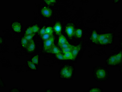 Immunofluorescence staining of HepG2 cells with CSB-PA013400LA01HU at 1:133, counter-stained with DAPI. The cells were fixed in 4% formaldehyde, permeabilized using 0.2% Triton X-100 and blocked in 10% normal Goat Serum. The cells were then incubated with the antibody overnight at 4°C. The secondary antibody was Alexa Fluor 488-congugated AffiniPure Goat Anti-Rabbit IgG(H+L).