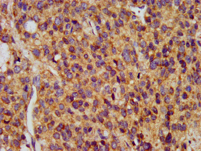 IHC image of CSB-PA013400LA01HU diluted at 1:400 and staining in paraffin-embedded human glioma performed on a Leica BondTM system. After dewaxing and hydration, antigen retrieval was mediated by high pressure in a citrate buffer (pH 6.0). Section was blocked with 10% normal goat serum 30min at RT. Then primary antibody (1% BSA) was incubated at 4°C overnight. The primary is detected by a biotinylated secondary antibody and visualized using an HRP conjugated SP system.