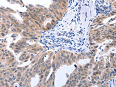 The image on the left is immunohistochemistry of paraffin-embedded Human ovarian cancer tissue using CSB-PA439945(MAP2K1 Antibody) at dilution 1/25, on the right is treated with synthetic peptide. (Original magnification: ×200)