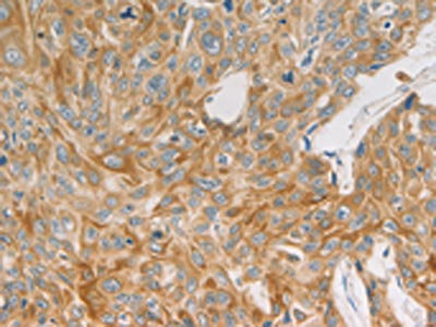 The image on the left is immunohistochemistry of paraffin-embedded Human esophagus cancer tissue using CSB-PA895516(MAP2K6 Antibody) at dilution 1/20, on the right is treated with fusion protein. (Original magnification: ×200)
