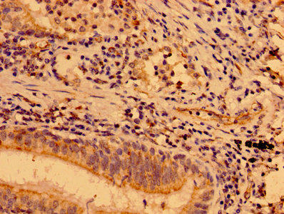 IHC image of CSB-PA013434LA01HU diluted at 1:400 and staining in paraffin-embedded human lung cancer performed on a Leica BondTM system. After dewaxing and hydration, antigen retrieval was mediated by high pressure in a citrate buffer (pH 6.0). Section was blocked with 10% normal goat serum 30min at RT. Then primary antibody (1% BSA) was incubated at 4°C overnight. The primary is detected by a biotinylated secondary antibody and visualized using an HRP conjugated SP system.