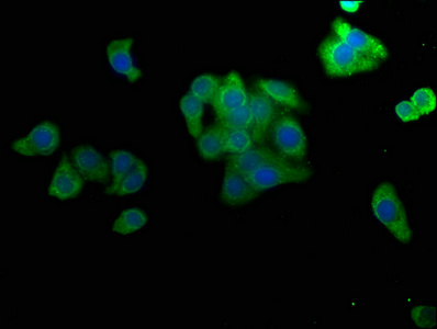 Immunofluorescence staining of HepG2 cells with CSB-PA013439LA01HU at 1:50, counter-stained with DAPI. The cells were fixed in 4% formaldehyde, permeabilized using 0.2% Triton X-100 and blocked in 10% normal Goat Serum. The cells were then incubated with the antibody overnight at 4°C. The secondary antibody was Alexa Fluor 488-congugated AffiniPure Goat Anti-Rabbit IgG(H+L).