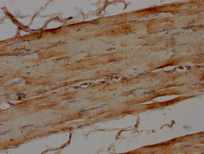 IHC image of CSB-PA013439LA01HU diluted at 1:100 and staining in paraffin-embedded human skeletal muscle tissue performed on a Leica BondTM system. After dewaxing and hydration, antigen retrieval was mediated by high pressure in a citrate buffer (pH 6.0). Section was blocked with 10% normal goat serum 30min at RT. Then primary antibody (1% BSA) was incubated at 4°C overnight. The primary is detected by a biotinylated secondary antibody and visualized using an HRP conjugated SP system.