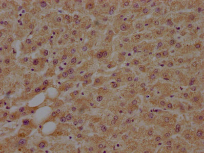 IHC image of CSB-PA013439LA01HU diluted at 1:100 and staining in paraffin-embedded human liver tissue performed on a Leica BondTM system. After dewaxing and hydration, antigen retrieval was mediated by high pressure in a citrate buffer (pH 6.0). Section was blocked with 10% normal goat serum 30min at RT. Then primary antibody (1% BSA) was incubated at 4°C overnight. The primary is detected by a biotinylated secondary antibody and visualized using an HRP conjugated SP system.