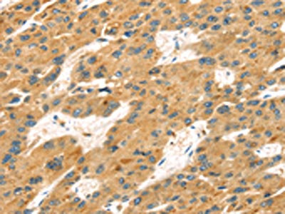 The image on the left is immunohistochemistry of paraffin-embedded Human liver cancer tissue using CSB-PA302315(MAPK12 Antibody) at dilution 1/25, on the right is treated with fusion protein. (Original magnification: ×200)