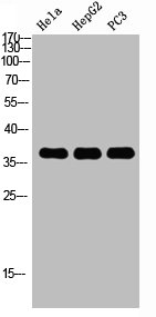 Western Blot analysis of HELA HEPG2 PC-3 using p38 Polyclonal Antibody. Antibody was diluted at 1:1000. Secondary antibody was diluted at 1:20000