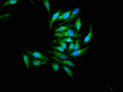 Immunofluorescence staining of Hela cells with CSB-PA013471LA01HU at 1:266, counter-stained with DAPI. The cells were fixed in 4% formaldehyde, permeabilized using 0.2% Triton X-100 and blocked in 10% normal Goat Serum. The cells were then incubated with the antibody overnight at 4°C. The secondary antibody was Alexa Fluor 488-congugated AffiniPure Goat Anti-Rabbit IgG(H+L).