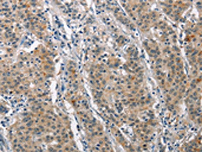 The image on the left is immunohistochemistry of paraffin-embedded Human gastic cancer tissue using CSB-PA994185(MAPT Antibody) at dilution 1/25, on the right is treated with synthetic peptide. (Original magnification: ×200)