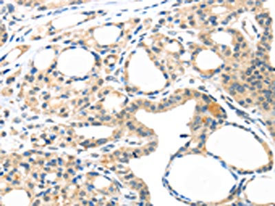 The image on the left is immunohistochemistry of paraffin-embedded Human thyroid cancer tissue using CSB-PA178736(MASP2 Antibody) at dilution 1/35, on the right is treated with synthetic peptide. (Original magnification: ×200)