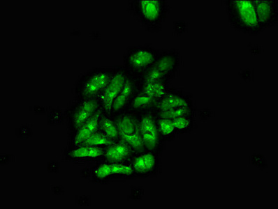 Immunofluorescent analysis of Hela cells using CSB-PA013551LA01HU at dilution of 1:100 and Alexa Fluor 488-congugated AffiniPure Goat Anti-Rabbit IgG(H+L)